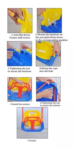 Columpio 3 En 1 Para Niños Y AdolescentesDiseño 3 en 1: el swing tiene el diseño de una combinación de 3 en 1 que satisface la demanda suficiente para el crecimiento de sus hijos. Se adapta desde bebés hasta adolescentes.SEGURO Suficiente: el manillar delantero y el respaldo del asiento, que cuenta con un cinturón para mantener a su hijo en la posición correcta, mantener la seguridad. 4 cuerdas de nylon están unidas en el asiento para distribuir el peso de manera uniforme, y el diseño especial de la hebilla para la cuerda de nylon protege el columpio de las vueltas.Altura ajustable: El columpio es fácil de ajustar la longitud de la cuerda para colgar de acuerdo con sus necesidades. Esto le ahorrará muchos problemas para encontrar un lugar adecuado para instalar.Duradero y de uso prolongado: hecho de plástico de alta calidad, sólido y duradero, que garantiza una larga vida útil.Fácil de ensamblar: este columpio se combina con broches y tornillos, un destornillador fácil de usar para ensamblar. Con la configuración adecuada, no te preocupes por el giro, giro o inclinación•Características del producto:- Multicolor- Peso: 2 kg- Dimensiones: 16,51x40,64x43,18CM