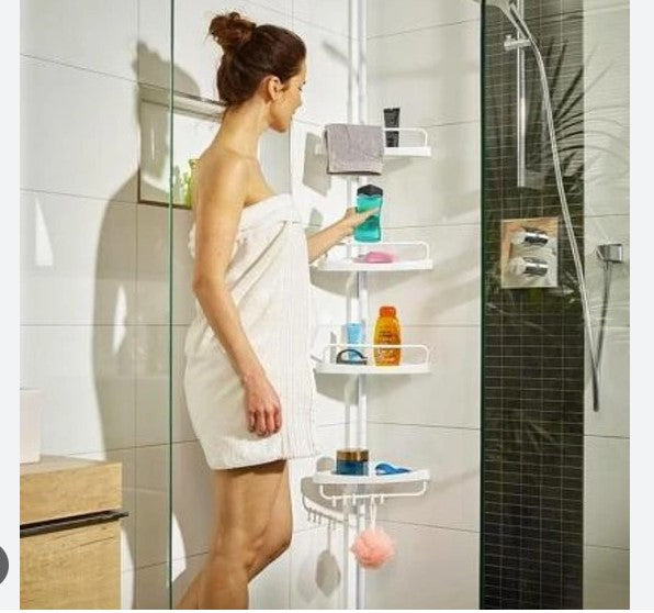DescripciónEstante de esquina para baño de 4 niveles con plato de ducha de pie de acero inoxidableMaterial: acero inoxidable + PP (polipropileno)Tamaño: aprox.: 21,5 x 33,5 x 100-260 cmColor: blanco/Marfil- Capacidad de la bandeja: 16 kg- Altura ajustable de 100-260 cm para adaptarse a la mayoría de los baños- El poste ajustable y libre de óxido utiliza tensión para encajar entre el suelo de baño y el techo, tensión montada para un fácil montaje sin herramientas ni taladros necesarios- El poste está cubierto con un resorte, proporcionando la tensión necesaria para sujetar el poste en su lugar- También incluye una diapositiva superior capaz de guardar las toallas- Todos los estantes se drenan automáticamente y son fáciles de mantener limpio y ordenado- La Barra de soporte vertical con resorte se ajusta automáticamente para encajar entre el techo, el piso, el techo y el borde del baño- Cuatro estantes ajustables mantienen todo con un diseño especial para sostener botellas- Fabricado en acero con tapas de goma antideslizantes- Le permite más espacio libre en su baño y mantiene sus elementos esenciales ordenados y de fácil acceso- Ideal para champús, esponjas, acondicionadores o Hora del baño esencialesNota: El estante viene plano y sin montar. Fácil ensamblaje, instrucciones al costado de la caja
