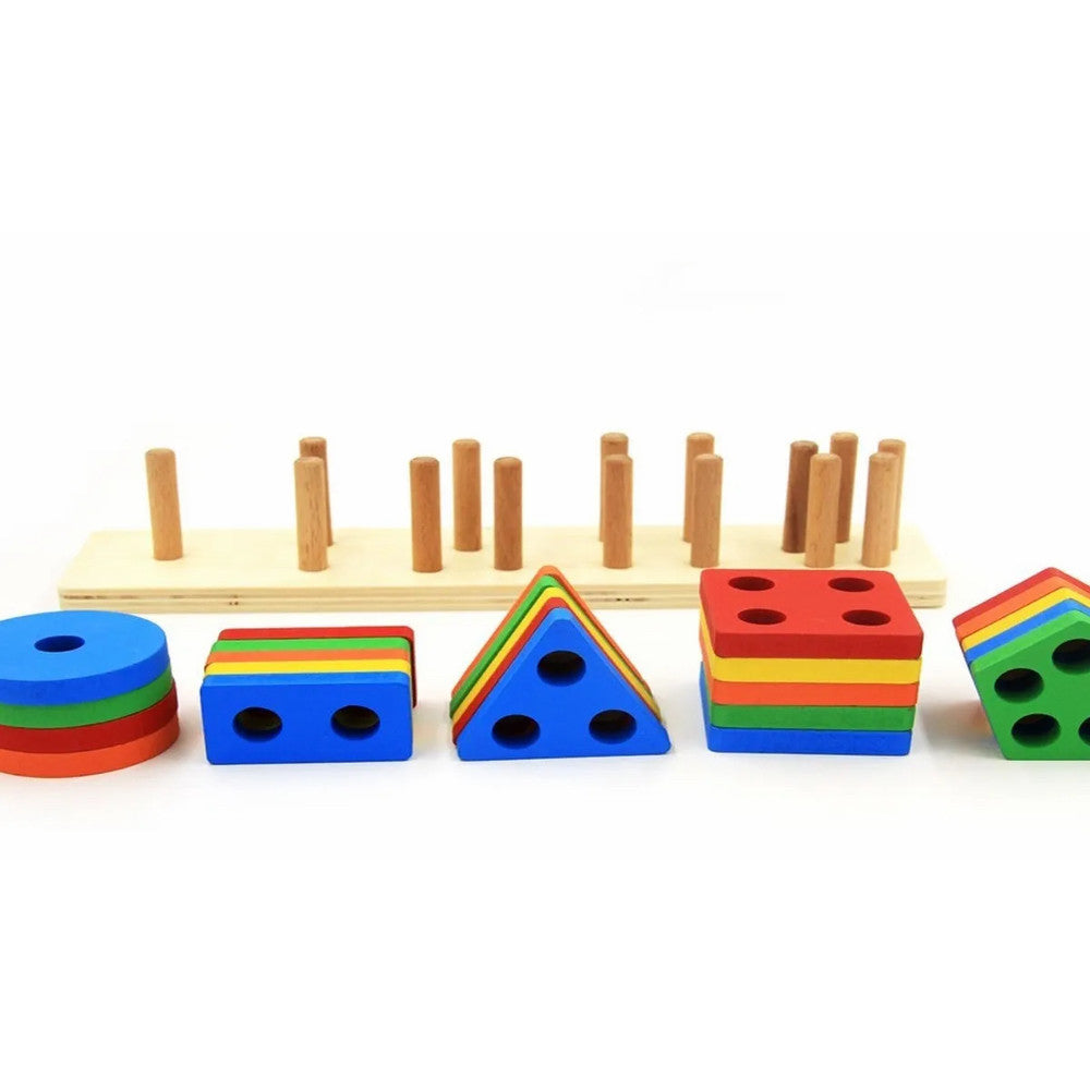 Medidas: 31 cm x 8 cm a x 7 cmDIVERSIÓN Y ENTRETENIMIENTO Bloques apilables geométricos de madera en diferentes formas y colores brillantes. Clasifique, combine y apile en postes de madera con el color correspondiente. 5 formas y 5 colores.MEJORE LAS HABILIDADES El juego de rompecabezas interactivo y educativo ayuda a los niños en edad preescolar a aprender a clasificar y combinar formas y colores. Mejora la motricidad fina y el reconocimiento de colores. Fomenta el juego independiente.DISEÑO ADECUADO PARA NIÑOS Tamaño perfecto para las manos de los niños pequeños. El tamaño grueso y el borde liso facilitan el agarre de los dedos pequeños.SEGURO PARA NIÑOS PROBADO hecho con madera duradera de alta calidad, sin BPA, sin plomo, sin ftalatos, segura para niños, este juguete está construido para durar. Ideal para edades de 18 meses 2, 3 y 4 años