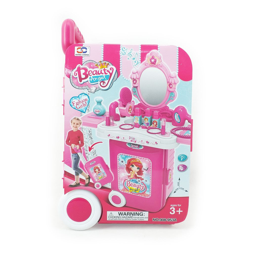 TOCADOR MALETIN 3 EN 1 Permita que sus hijos utilicen la creatividad y la inventiva cuando se divierten. También comprenderán qué son los accesorios y cómo se utilizan. Gran idea para un regalo! Fantástico para los niños que están interesados en juegos de roles y disfrazarse. El espejo puede emitir un sonido cuando se presiona un botón rosa en forma de corazón en la parte superior, un espejo que usa una batería AAA de 3 piezas. Ideal para edades de 3 años y más: las piezas tienen el tamaño perfecto para manos más pequeñas, lo que permite a los niños desarrollar sus habilidades motoras finas. Ligero y fácil de llevar – ¡Tu niña puede empacar su acto y llevarlo a la carretera! El estuche incluido no solo limpia la brisa, sino que también permite que los niños lleven este juego a la casa de un amigo o en un viaje largo en automóvil.INCLUYE:1 MALETIN-TOCADOR2 Pulseras3 Anillos2 Barras de labios3 Esmaltes de uñas1 Peine1 Secadora de cabello1 Espejo —-Requiere Baterías: 3 x «AAA» (No Incluidas)